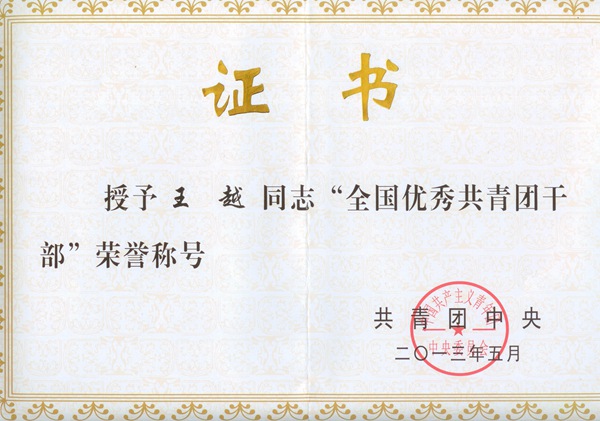 1、2013年5月3日,根據《共青團中央關于表彰2012年度“全國優秀共青團員”、“全國優秀共青團干部”、“全國五四紅旗團委(團支部)”的決定》(中青發[2013]8號),集團公司團委書記王越榮獲2012年度全國優秀共青團干部榮譽稱號。
