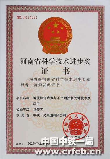近日,中鐵一局新運公司鄭州地鐵維管項目部、鄭州地鐵12號線項目部參與編制的“地鐵軌道聲振與不平順控制關鍵技術及應用”成果,榮獲2025年度河南省科學技術進步獎“三等獎”。這是新運公司深耕地鐵維管領域、堅持科技創新的重要成果。