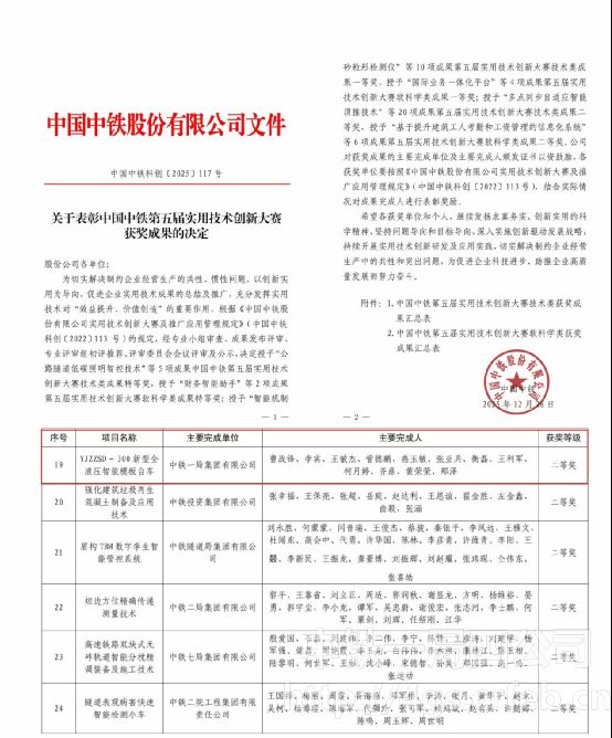 近日,中國中鐵公布了第五屆實(shí)用技術(shù)創(chuàng)新大賽獲獎名單,由公司主持完成的《YJZZSD-300 新型全液壓智能模板臺車實(shí)用技術(shù)》憑借突出的創(chuàng)新性、實(shí)用性及應(yīng)用價值,成功斬獲技術(shù)類二等獎,這也是公司在該項(xiàng)賽事中首次獲獎,標(biāo)志著其在隧道施工智能化裝備研發(fā)領(lǐng)域取得重要突破,為深化“一局質(zhì)建”品牌建設(shè)注入強(qiáng)勁動能。