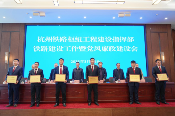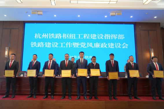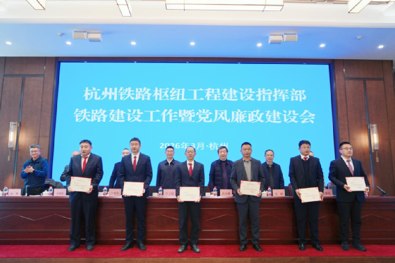 浙江杭州訊:3月10日,杭州鐵路樞紐工程建設(shè)指揮部召開2026年鐵路建設(shè)工作暨黨風(fēng)廉政建設(shè)會議,對2025年度鐵路建設(shè)工作中表現(xiàn)突出的先進(jìn)集體、優(yōu)秀個人進(jìn)行表彰。中鐵一局黨委副書記、工會主席劉為帛出席會議。中鐵一局杭州機場高鐵3標(biāo)項目江東特大橋跨臨鴻東路(40+72+40)米連續(xù)梁工點榮獲“文明工地”稱號,第一架子隊獲評“優(yōu)秀架子隊”,5人分別榮獲“優(yōu)秀項目總工”“先進(jìn)工作者”稱號。
