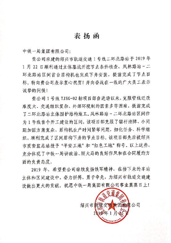 紹興軌道交通集團向中鐵一局發來表揚信