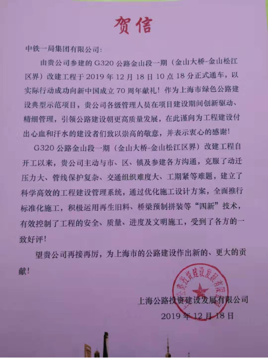 信中稱贊公司參建的G320公路改建工程正式通車,以實(shí)際行動(dòng)向新中國(guó)成立70周年獻(xiàn)禮。作為上海市綠色公路建設(shè)典型示范項(xiàng)目,公司各級(jí)管理人員在項(xiàng)目建設(shè)期間創(chuàng)新驅(qū)動(dòng)、精細(xì)管理,引領(lǐng)公路建設(shè)朝更高質(zhì)量發(fā)展,為工程建設(shè)付出了心血和汗水。