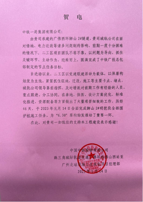 廣佛西環(huán)二工區(qū)項(xiàng)目收到中鐵廣投廣佛環(huán)線總包部賀電