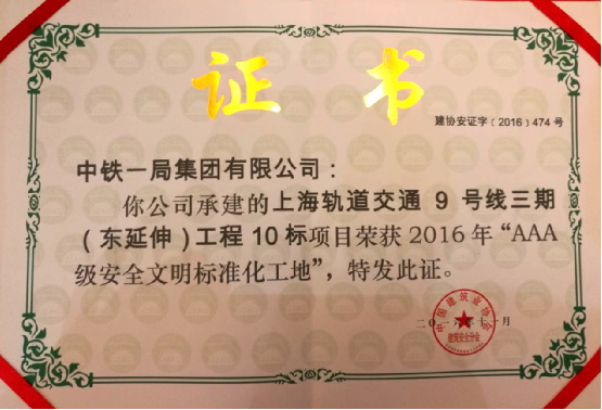 11月30日,由公司承建的上海軌道交通9號線三期(東延伸)工程10標項目喜獲中國建筑業協會建筑安全分會頒發的2016年“AAA級安全文明標準化工地”榮譽稱號。