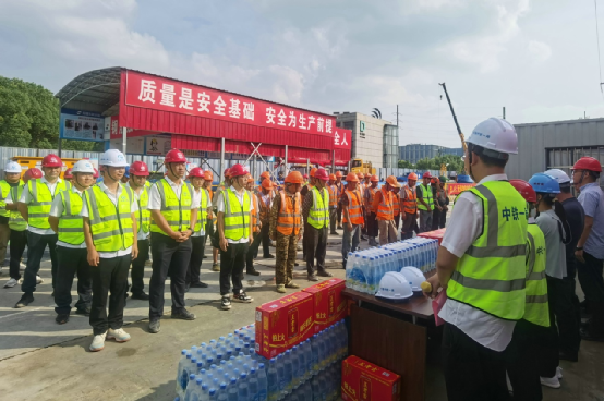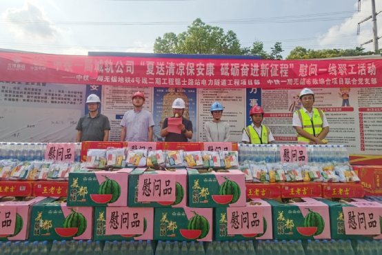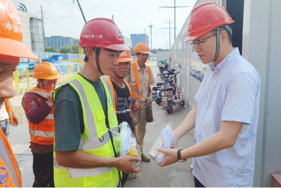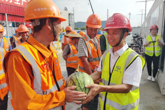 與會(huì)領(lǐng)導(dǎo)共同為一線作業(yè)工友送去了西瓜、鹽汽水等清涼物資及藿香正氣水、人丹等防暑禮包,將關(guān)懷送到了每個(gè)工友的手中。