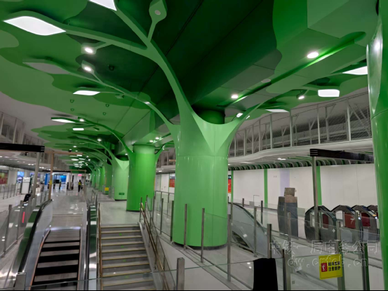 施工過程中,項目部深度運用BIM技術,對機電管線、異型裝飾構件開展三維模擬與“預裝配”施工。其中,在溪涌站“生命之樹”藝術造型施工中,成功實現鋼結構支撐與強弱電管線的精準融合,攻克毫米級安裝精度技術難關,讓這座“把公園搬進地下”的車站成為全線特色人文地標。同時,項目部構建全員、全過程、全方位的安全質量管理體系,實現施工全過程零安全事故、零質量隱患,如期優質完成施工任務,為深圳地鐵8號線三期工程順利開通運營提供了堅實支撐。