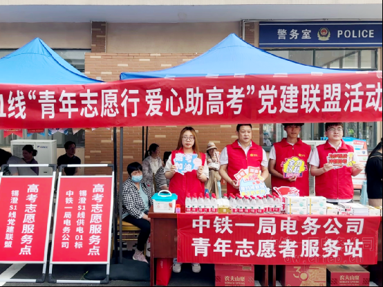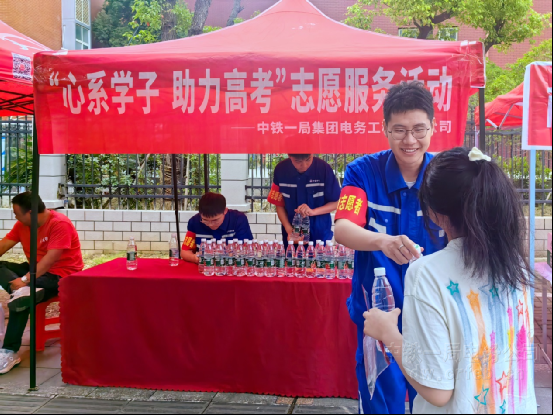 在無錫,八分公司無錫至江陰城際軌道供電項目聯合錫澄中車S1線總包部、信號標,開展了“青年志愿行 愛心助高考”黨建聯盟活動。志愿者們一早便在考場外搭建涼棚,設立高考志愿服務站點,為高考學子與送考家長提供免費愛心服務。現場備有愛心座椅、提供免費礦泉水、紙巾、口罩,準備了本子、筆、橡皮等學習用品。服務站點設立“愛心醫療箱”,配備了創可貼、碘伏、布洛芬、氯雷他定等常用應急藥品。針對近日高溫天氣,藿香正氣水、清涼油、花露水、蚊香等物資與一應俱全。志愿者現場為考生發放礦泉水,提醒他們沉著應考,冷靜答題,并為他們加油鼓勁,真誠的祝福感動著每位考生;邀請考場外陪考的家長落座涼棚,與他們聊天拉家常,緩解家長焦慮的情緒,優質的服務贏得廣大考生及家長的一致好評。