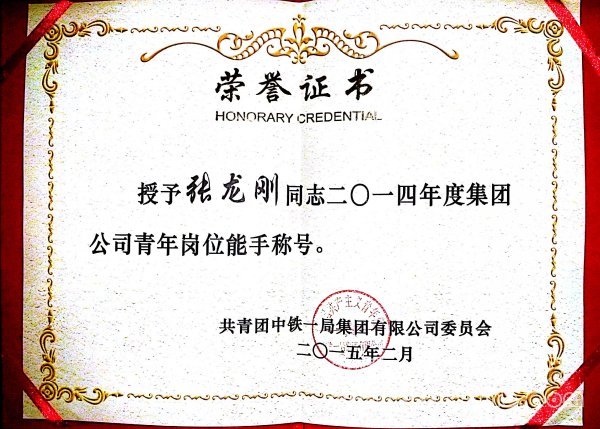 張龍剛榮獲2014年度集團公司青年崗位能手稱號