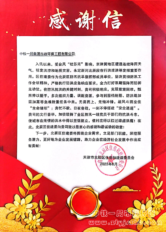 近日,天津市北辰區(qū)住房和建設(shè)委員會發(fā)來感謝信,信中對公司在“杜蘇芮”臺風(fēng)期間克服重重困難,組織力量,調(diào)配資源,戰(zhàn)風(fēng)斗雨壘住“生命堤壩”,一刻不停搭建“安全通道”的義行善舉,在抗洪搶險攻堅戰(zhàn)中展現(xiàn)出的社會責(zé)任與擔(dān)當表示感謝并致以誠摯敬意。