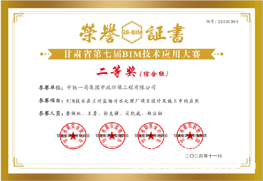 BIM技術在武威涼州城區污水處理廠工程設計及施工中的應用成果,榮獲中國市政工程協會舉辦的2024年第六屆“市政杯”BIM應用技能大賽二類成果及2024年甘肅省第七屆BIM技術應用大賽一等獎。BIM技術在蕭山錢江超大型地埋式污水處理廠設計及施工中的應用成果,榮獲第五屆工程建設行業BIM大賽三等成果。BIM技術在蘭州鹽場污水處理廠項目設計及施工中的應用成果,榮獲2024年甘肅省第七屆BIM技術應用大賽二等獎。