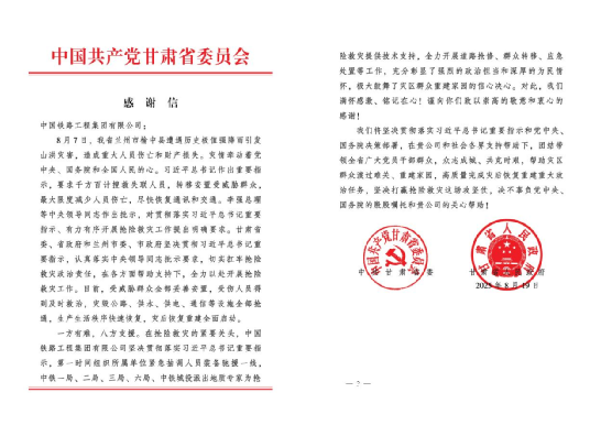 近日,中共甘肅省委在致中國鐵路工程集團有限公司的感謝信中,特別提及并肯定了中鐵一局在此次救災中的突出貢獻,稱贊其用實際行動詮釋了“一方有難、八方支援”的精神,彰顯了強烈的政治擔當與深厚的為民情懷。