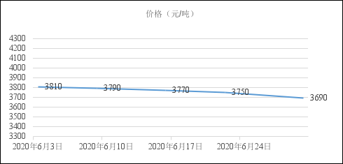 2020年6月上旬,國內建筑鋼材價格小幅上行,中旬起,隨著雨季來臨,現貨呈沖高回落走勢。下圖為西安地區螺紋鋼HRB400EФ20mm價格走勢。
