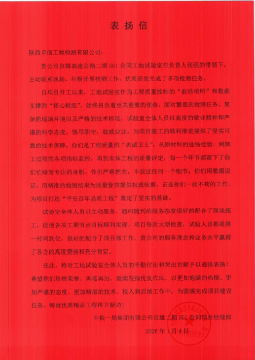 與此同時,在西渝高鐵康渝段二標項目建設中,公司現場檢測小組憑借精湛的技術能力、高度的責任心和出色的協調能力,為項目實現“完工零缺陷”目標提供了核心技術支持。項目部在表揚信中特別提到,公司在項目部提出的各項額外工作任務時,始終響應迅速、全力配合,以優質的服務理念踐行合作初心,展現了良好的企業風貌。