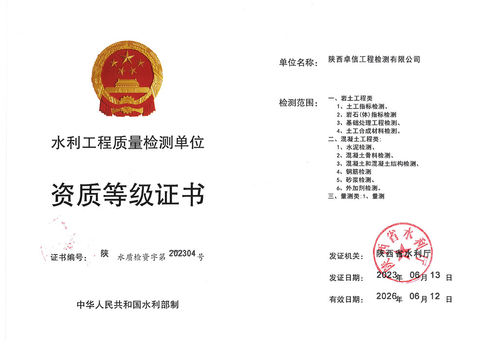 可承擔除大型水利工程(含一級堤防)主要建筑物以外的其他各等級水利工程的混凝土工程、巖土工程和量測類質量檢測業務。 水利工程質量檢測單位資質等級證書